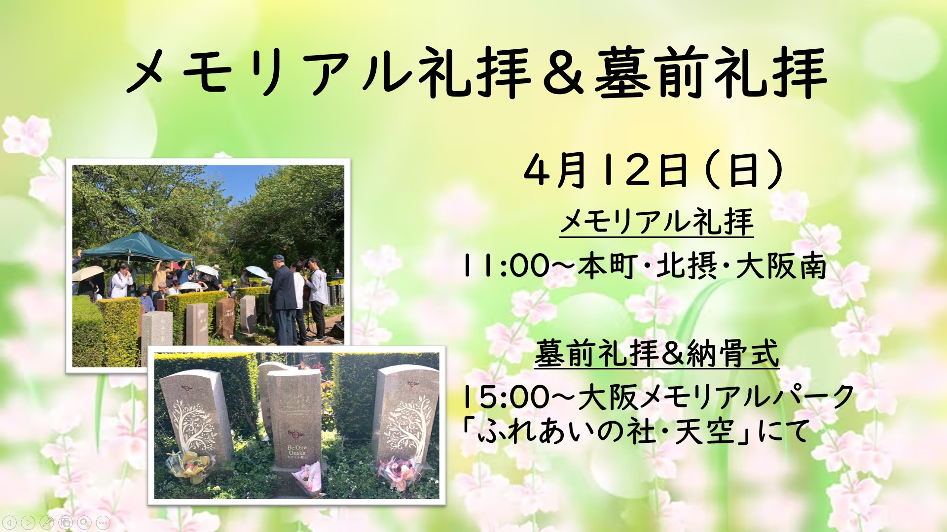 日曜礼拝 11:00〜12:30:本町・北摂・大阪南