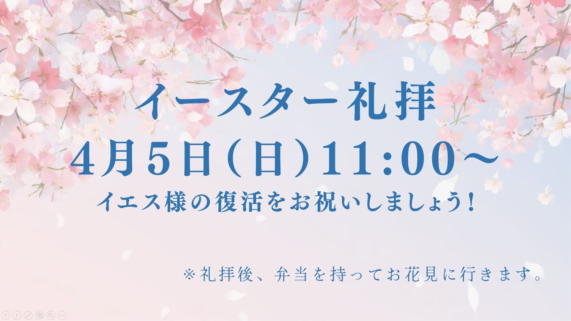 Welcome to the Be One Osaka Christian Church website. On Sunday, April 5th, we will be holding our Easter Worship Service. After the service, we will head to a nearby park at each location for a hanami (cherry blossom viewing) — please bring your own bento lunch! If you would like to attend for the first time, please contact us via our official LINE. We look forward to seeing you as we celebrate the resurrection of Jesus together.